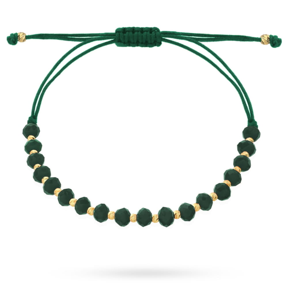 Złota bransoletka kulki i szmaragdowe kamienie na zielonym sznurku 585