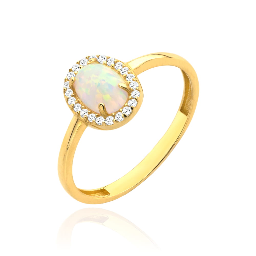Złoty pierścionek Opal owalny otoczony cyrkoniami 585