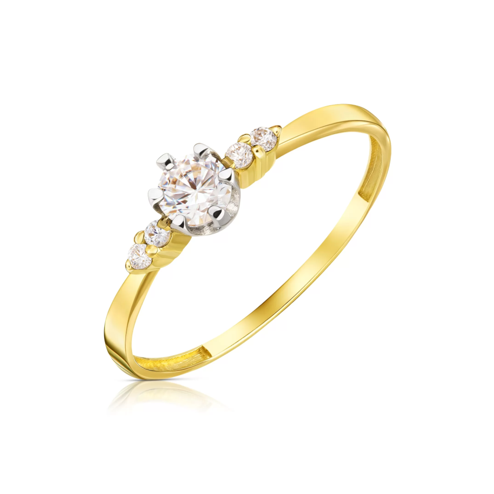Pierścionek złoty z centralną cyrkonią i subtelnym zdobieniem