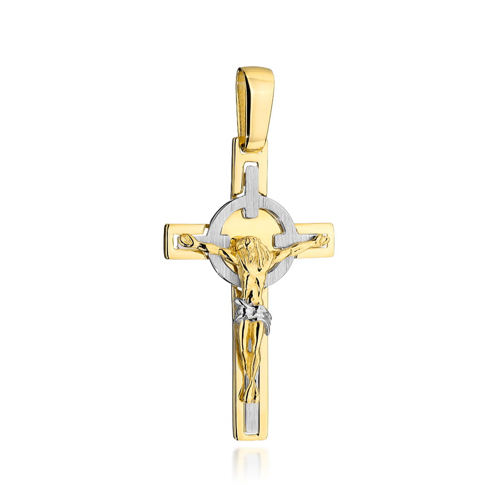 Złoty krzyż Benedyktyński trójwymiarowy z białym złotem 585